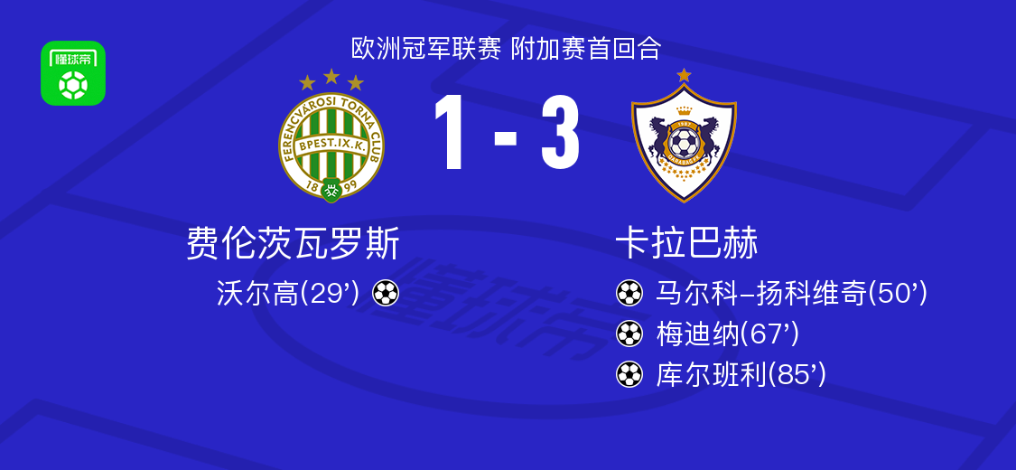 卡拉巴赫3-1逆转费伦茨瓦罗斯,库尔班利建功,梅迪纳破门